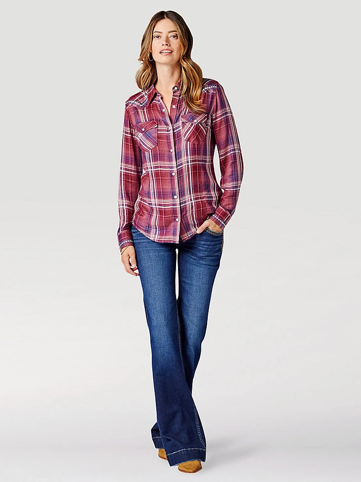 For those chillier days, there’s nothing better than a nice flannel shirt to keep you cozy no matter what you have planned. Add some Western flair to your flannel collection with the Wrangler Retro® long-sleeve embroidered yoke Western snap shirt. Designed to fit under your snuggliest sweater, this soft and stretchy plaid dream is perfect for layering for any kind of weather. Pair it with your favorite Wrangler® pullover for an ensemble that’s as versatile as you are.