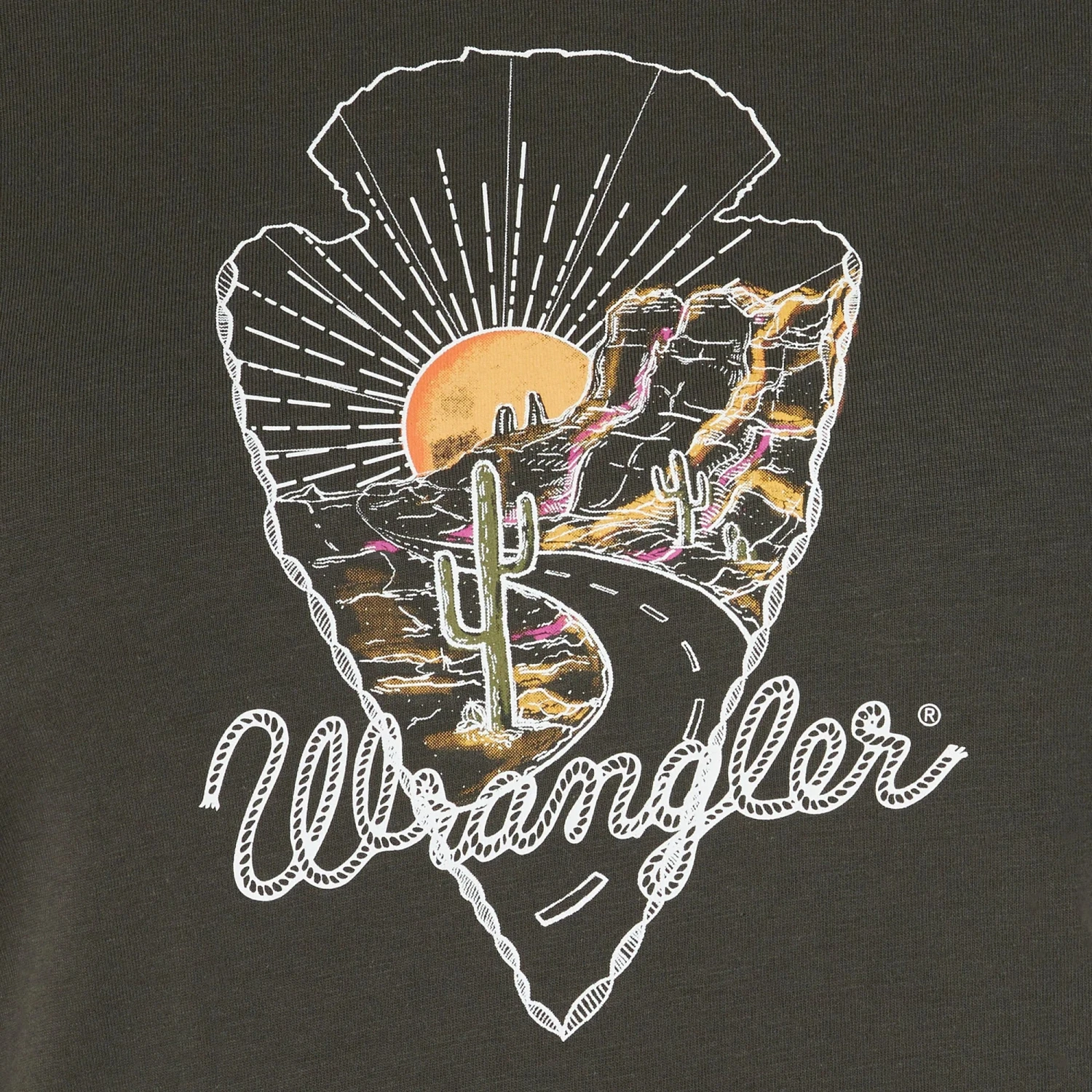 This Wrangler Retro® graphic tee comes with the classic crewneck styling for versatility and a bold graphic print across the chest of an arrowhead featuring an old desert highway curving toward the sunset.