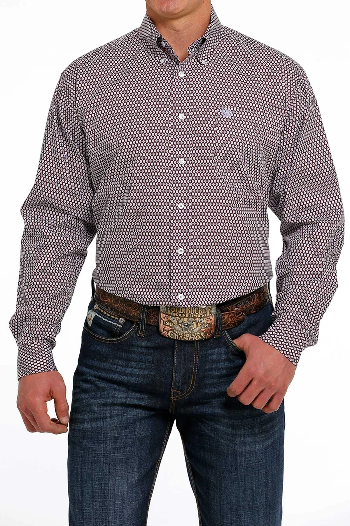 Power-up for a day at the office wearing a purple geometric printed cotton plain weave engineered by CINCH. This on-trend shirt features a classic design with an open left front pocket, embroidered logo and white buttons.