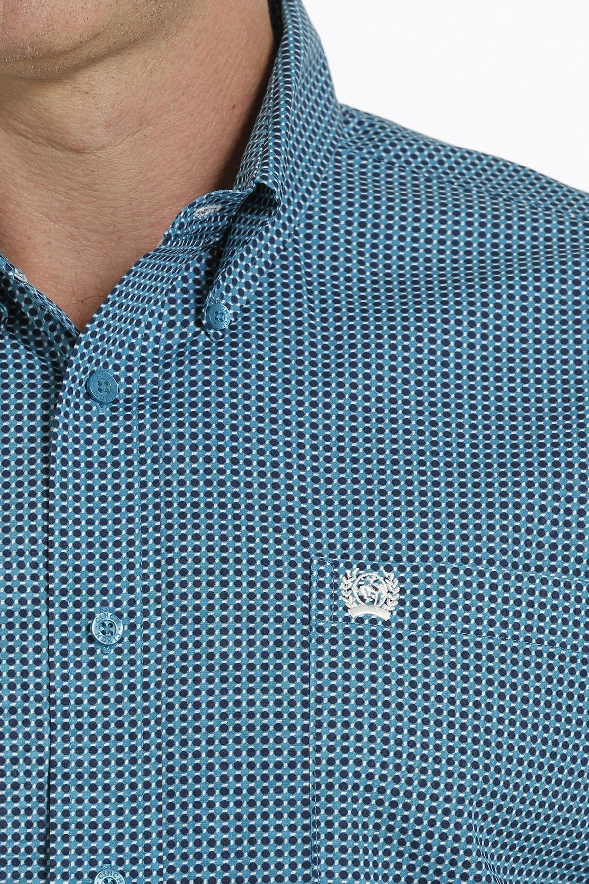 Take smart dressing to a new level with this teal geometric printed cotton plain weave made up by CINCH. This good-looking shirt features teal buttons, an open left front pocket and embroidered logo.