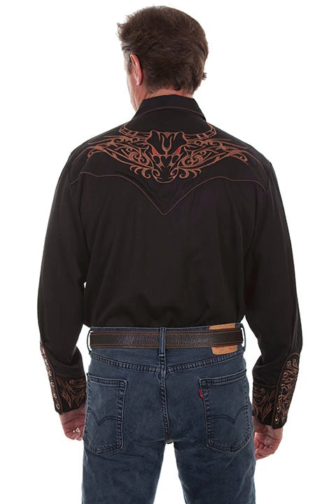 This Scully long sleeve shirt is for the man that likes to make a statement when he goes out. It features an elaborate scrolled embroidery on front and back yokes. Can you find the bucking bull on the front yokes? The back features a stylized longhorn with scroll design.
