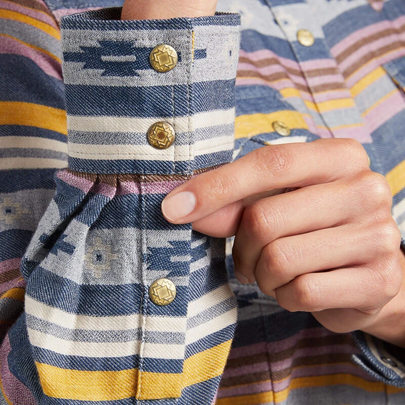 This fresh take on the Western-style button-down is designed with jacquard fabric featuring multi-color serape stripes. Beautifully structured silhouette.